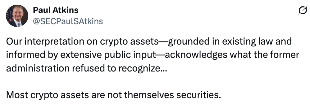 “Our interpretation… establishes four asset categories that are not deemed to be securities… digital commodities, digital collectibles, digital tools, and payment stablecoins… Only one crypto asset class remains subject to securities laws… digital securities.”